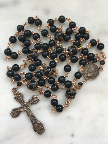 Saint Joseph Black Onyx Rosary - Bronze Medals - Lilies Crucifix CeCeAgnes