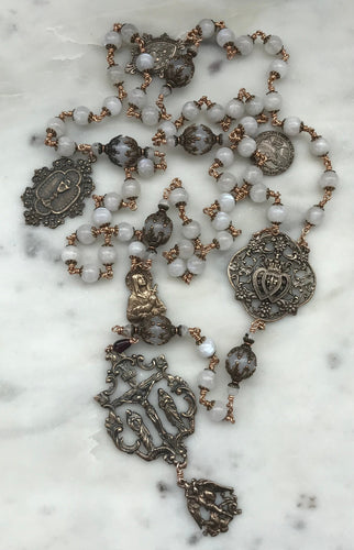 White Moonstone and Bronze Rosary - Antique French Reproduction Medals CeCeAgnes