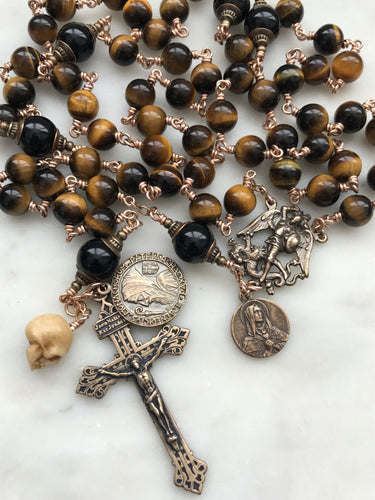 Saint Michael Rosary - Tiger Eye and Bronze - Saint Benedict - Memento Mori CeCeAgnes