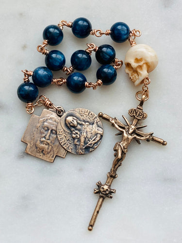 Memento Mori Rosary - Saint Lucy - Holy Face of Jesus - Kyanite and Ox Bone Skull - Bronze - Wire-wrapped Tenner - CeCeAgnes