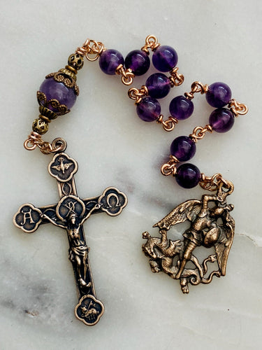 Saint Michael Pocket Rosary - Amethyst and Bronze - Single Decade Rosary - Alpha Omega Crucifix CeCeAgnes