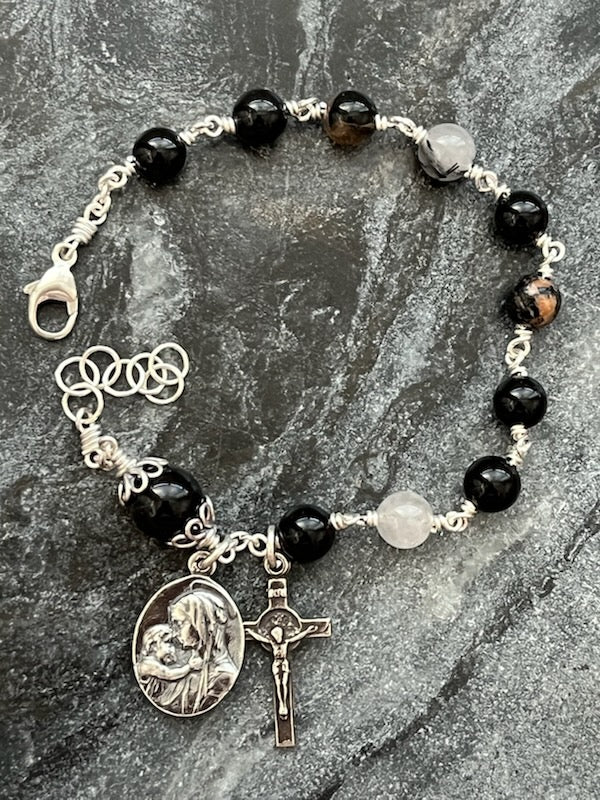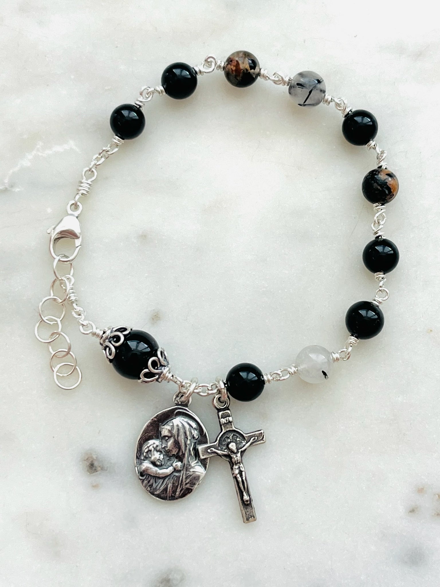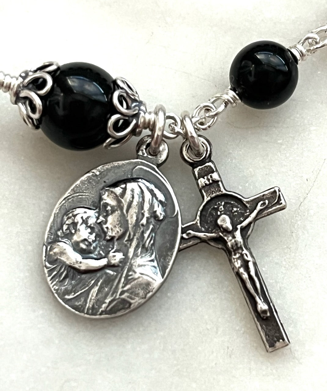 Beautiful handmade 6 and 8mm black tourmaline, obsidian and onyx rosary bracelet. The beads are wire-wrapped with sterling silver, 22 gauge wire and all other metal parts and medals are sterling silver.