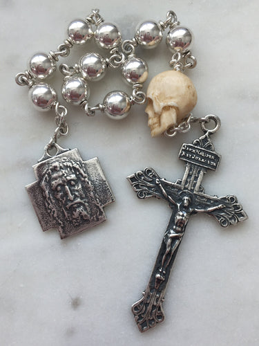 Memento Mori Rosary - Holy Face of Jesus - Ox Bone Skull - Sterling Silver - Wire-wrapped Tenner - Pardon Crucifix