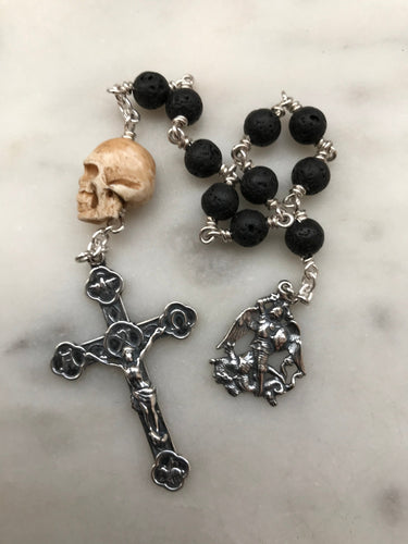 Memento Mori Pocket Rosary - Lava Bead and Ox Bone Skull - Sterling Silver - Tenner - Saint Michael - Single Decade Rosary CeCeAgnes