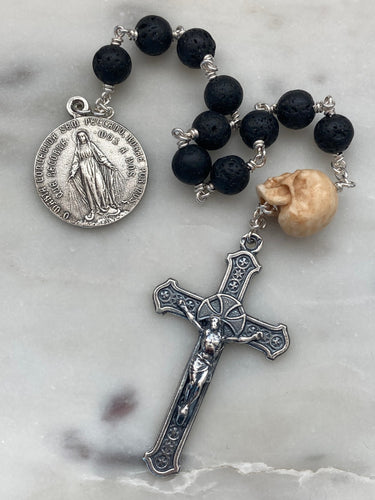 Memento Mori Pocket Rosary - Lava Bead and Ox Bone Skull - Sterling Silver - Tenner - Miraculous Medal - Single Decade Rosary CeCeAgnes